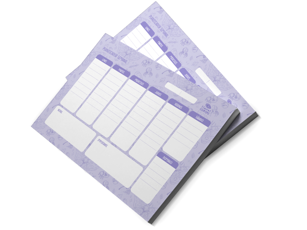 Organizador semanal presentado en bloc de 52 Hojas A4 con base de cartón.